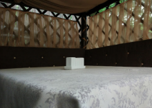Відмінна велика альтанка для свят в теплу погоду на 15 осіб. І ще багато невеликих альтанок. Смачна кухня. Бувають іноді сюрпризи, у вигляді кіслющей сметани або недожаренного дерунів. Персонал намагається і посміхається. Відчуваєш себе в заміському ресторані. Маленький оазис спокою і тиші в місті.